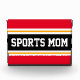 Este diseño deportivo, atlético, presenta texto en negrita SPORTS MOM dentro de una banda ancha negra realzada con doble franjas de carreras blancas y amarillas contra rayas exteriores brillantes rojas. El texto de este diseño se puede personalizar.