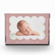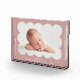 Bloque fotográfico simple y moderno con anuncio de nacimiento que muestra la foto de su bebé enclavada dentro de un polvoriento marco de vieiras rosa. Personalice el bloque de fotos agregando el nombre de su bebé e información adicional en letras blancas.
