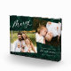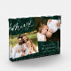 Elegante bloque de fotos vacacional con "Merry" en un moderno guión de caligrafía blanca sobre un fondo de manto verde pintado. Personaliza el bloque de fotos de Navidades agregando dos de tus fotos favoritas, saludo, nombre y año.