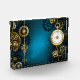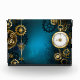 fondo turquesa, texturado, de vapor punk con bronce y oro, llave de plata y reloj. Estilo Steampunk.