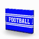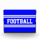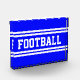 Este diseño deportivo, presenta texto atlético atlético atlético de FOOTBALL dentro de amplias franjas de carreras blancas contra el brillante fondo azul real.