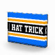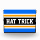 Este diseño deportivo, de hockey, presenta el texto en negrita del GORRA TRICK dentro de una franja negra ancha resaltada con pinstripes blancas y amarillas contra rayas exteriores de color azul brillante. El texto de este diseño se puede personalizar.