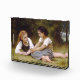 El cálido sol otoñal se deslizó a través de las hojas del árbol de avellanas, lanzando sombras bailando en el suelo del bosque. Dos jóvenes chicas, Elise y Juliette, se sentaron bajo sus ramas, un pequeño montón de nueces doradas enclavadas entre las hojas caídas. - Elise, la mayor de las dos, se inclinó contra la corteza áspera del árbol, un glint malicioso en sus ojos. Ella sostenía un puñado de nueces sobre la cabeza de Juliette. "¡Intenta atraparlos, menuda souris!", gritó, esparciendo las nueces con una risita encantadora. - Juliette, un torbellino de movimiento, persiguió a las nueces que caían, sus risas retumbaban en el bosque. Se encogió un puñado, la cara enrojecida con esfuerzo y deleite. "¡Eres imposible, Elise!", exclamó, sin aliento. - Elise sonrojó, sus ojos brillando en las esquinas. "¡Esa es la idea, mamáes petite!", replicó, arrojando algunas nueces más al aire. - Se tambaleaban y rodaban entre las hojas, sus risas se mezclaban con el suave rusteo de los árboles. Por un momento, el mundo parecía encogerse ante sólo los dos, perdidos en su propio juego privado. - Juliette, cogiendo el aliento, miró a su alrededor la luz solar que se filtraba por las hojas. "Es tan hermoso aquí", suspiró contentosamente. "Ojalá pudiéramos quedarnos aquí para siempre." - Elise asintió, mirando hacia arriba el dosel de hojas. "Yo también", admitió. "Es como un jardín secreto". - Se quedaron callados, contentos con la compañía de los demás y la tranquilidad pacífica del bosque. Elise, siempre soñador, empezó a imaginar lo que harían con sus tesoros. "Quizá podríamos asarlos sobre el fuego", reflexionó, "y contar historias toda la noche". "O tal vez podríamos hacer un collar para Grand-mère", sugirió, con su voz llena de emoción. "A ella le encantan los collares de avellana". - Cuando el sol empezó a sumergirse por debajo del horizonte, arrojando largas sombras a través del suelo del bosque, los chicas, a regañadientes, juntaron sus nueces y empezaron a llegar a casa. Caminaron de la mano, sus risas se desvanecieron a la distancia, dejando atrás un rastro de hojas de oro y el persistente aroma del otoño. - El bosque, una vez vivo con su plática lúdica, regresó a su tranquilo letargo, el único sonido del susurro suave del viento a través de los árboles. Pero el recuerdo de sus risas, como el aroma del humo de madera, perduró mucho después de que se fueron, un recordatorio de las simples alegrías de la infancia y la perdurable magia de un secreto compartido. - Les Noisettes o The Nut Gatherers es una pintura al óleo de 1882 del artista francés William-Adolphe Bouguereau. Este trabajo es de dominio público en su país de origen y en otros países y áreas donde la duración del derecho de autor es de más de 100 años o menos.