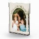 Modern and minimal family memory photo block featuring a photo in a arch frame with a text that says "Love Grows Here" with tiny hearts. Cream.