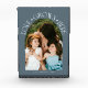 Modern and minimal family memory photo block featuring a photo in a arch frame with a text that says "Love Grows Here" with tiny hearts. Slate blue.