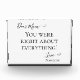 ¡El regalo divertido perfecto para tu madre! Decir es Querida Mamá, ¡tenías razón sobre todo! Amor, agrega tu nombre para personalizar. Las palabras Querida mamá y Amor están en bonito con letras con un toque moderno y la letra "Estabas en lo correcto sobre todo" es un impresionante tipo de letra de todos los mayúsculas que tiene mucho estilo. ¡Genial que una hija o un hijo le den a su madre! A ella le encantará presumir de esta placa porque no sólo es graciosa sino que se ve asombrosa en moda blanco y negro. Una manera humorística y dulce de hacerle saber cuánto la amas y aprecias su consejo.