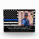 Honra a tu amado oficial de policía y con este regalo de foto en memoria de la delgada Línea Azul. Personaliza con la foto, nombre y número de placa de tu oficial, y fechas . Cita: Bien hecho, buen y fiel siervo. Mateo 25:23 . DERECHOS RESERVADOS © 2020 Judy Burrows, Black Dog Art - Todos los derechos reservados. Bloqueo fotográfico de la policía delgado de la línea azul