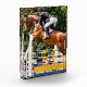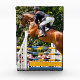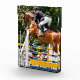 Diseño fotográfico de un caballo y jinete en una competencia de saltos.