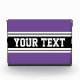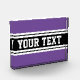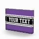 Este divertido diseño deportivo presenta texto atlético listo para personalizar, dentro de una franja negra ancha resaltada con rayas dobles blancas adjuntas contra un fondo violeta colorido.