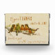 Adorable cuadro vintage de aves colgadas en una extremidad con el verso de la Escritura de Salmo 136:1, "Den gracias al Señor, porque Él es bueno..." Perfecto para mostrar en el día de Acción de Gracias. Diseñado por Simply Scripture; pintura de pájaros cortesía de Old Design Shop.