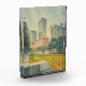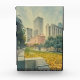 La imagen muestra un paisaje urbano en San Francisco, con edificios altos y palmeras. En primer plano se ve una zona de parque cubierta de hojas de otoño amarillas. El cielo está nublado, creando una atmósfera muda y ligeramente vintage. Los edificios son una mezcla de rascacielos modernos y estructuras de ladrillo rojo más antiguas.