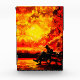 Una fascinante pintura digital que representa a una figura solitaria leyendo en un banco de un parque, silueta contra un cielo surrealista y feroz. Las nubes doradas giratorias y los tonos rojos profundos evocan un ambiente de ensueño, que recuerda a los expresivos pinceles de Van Gogh con un toque moderno. El suelo reflexivo realza el sentido de soledad y contemplación, haciendo de esta obra de arte perfecta para los amantes del paisaje abstracto, de fantasía y de la atmósfera. Ideal para impresiones de arte y decoración casera. Obra de arte digital surrealista inspirada en la puesta del sol, con un lector solitario en un paisaje de ensueño de tonos dorados. Ideal para los amantes del arte abstracto y atmosférico.
