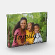 Moderno y elegante bloque de fotos horizontal de la mesa personalizado presenta una foto favorita con un mínimo diseño de superposición de tipografía "familiar" que incluye elegantes detalles floridos y lindos del corazón. Se puede modificar el color del texto negro.