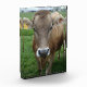 Retrato de una vaca de Jersey frente a la cámara en un exuberante pasto verde. En la campiña de Ohio, con la línea de los edificios de la finca al fondo.