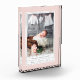 Cree un toque de atención a la llegada de su bebé con nuestro elegante bloque acrílico independiente, con una elegante paleta de colores pastel de color rosa y gris paloma. El diseño muestra una sola foto de orientación vertical con el nombre y las estadísticas de nacimiento de la bebé, enmarcada por un sutil patrón punteado en blanco y negro con un borde gris.