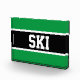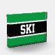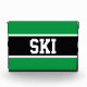 Este diseño deportivo presenta texto SKI en negrita dentro de una banda negra horizontal central amplia resaltada contra un fondo verde brillante. El texto es opcional y se puede personalizar.
