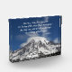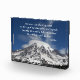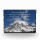 Bloque de fotos acrílico para exhibición que muestra la foto de una nube de capucha sobre el techo de nieve del Monte Rainier junto con una cita filosófica del historiador Sócrates.