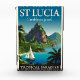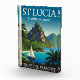 Stunning retro travel poster of St. Lucia featuring the famous Piton mountains rising dramatically from the turquoise Caribbean sea.