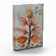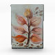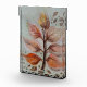 Sheer translucent llose decorative autumn leaves in yellow, orange and red tones, on a mint green background.