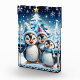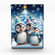Tres adorables pingüinos están parados en festivos gorras de invierno y coloridas bufandas. Sus grandes ojos redondos brillan de alegría, mientras que sus esponjosas campanas blancas contrastan con el brillante árbol de Navidad azul decorado con luces brillantes. Los pingüinos sonríen alegremente y parecen listos para celebrar la magia de la temporada navideña. A su alrededor, delicados copos de nieve bailan a través del aire, mientras las estrellas brillan en el cielo, creando un ambiente cálido y festivo. Este diseño captura perfectamente el espíritu de los Navidades - lleno de alegría, amistad y maravilla de invierno!