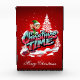 Un elfo personalizado alegre con ropa verde y oreja olas de un paisaje nevado. Las palabras "Tiempo del Navidad" están escritas en letras grandes, coloridas, de estilo graffiti, con un esquema de color rosa y azul. El fondo es rojo intenso, lo que sugiere un ambiente festivo. Los copos de nieve caen suavemente, añadiendo un toque de invierno.