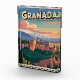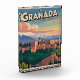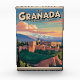 Retroceder en el tiempo con este afiche de viajes de estilo vintage de Granada, España. Presenta la emblemática Alhambra y las montañas de Sierra Nevada en cálidos colores andaluces. Perfecto para viajeros, amantes de España y aficionados al arte de viajes retro.