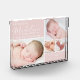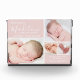 Un hermoso recuerdo para compartir las noticias de la llegada de tu bebé. El bloque rosa presenta un collage de 4 fotos con el nombre del bebé en una moderna tipografía escrita a mano en blanco. Todos los demás detalles clave incluyendo fecha de nacimiento, estadísticas de nacimiento, nombres de padres están en una simple tipografía blanca.