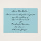Mini guardar las tarjetas de boda de anuncio de fecha son un recordatorio fácil y práctico para el invitado del evento próximo. La elegancia azul salva las tarjetas de fecha con un fondo negro de dos lados, el frontal ofrece un espacio para personalizar tu tarjeta con tu propia foto y nombres. También cuenta con una tira azul claro con un pequeño gráfico de rama floral en la parte superior de la banda. Ambos lados de la tarjeta tienen una plantilla de compilación para ayudarle a personalizar con todo su propio texto. Mini guardar las tarjetas de fecha están diseñadas como un gran estilo de tarjeta de visita. El diseño, que se ofrece en tres tamaños, puede caber fácilmente en cualquiera de los siguientes tamaños: Chubby (2,5" x 3,5") envasado como 100 tarjetas, Skinny (1" x 3") empaquetado como 20 tarjetas o Business (2" x 3,5") empaquetado como 100 tarjetas. Para elegir un tamaño diferente, simplemente seleccione la pestaña "Opciones de tarjeta de visita". Utilice la plantilla prehecha para guardar personalizares las tarjetas de fecha con toda su propia redacción. Cambie el estilo de texto y/o el tipo de letra seleccionando la función "personalizar".