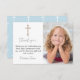 Celebra la Primera Comunión Sagrada de tu hijo con estilo y agradece a tus invitados por su presencia con nuestras exquisitas tarjetas de agradecimiento de la Primera Comunión. Con un impresionante crucifijo ornamentado con efecto oro y un mensaje de personalizable que le permite expresar su gratitud a su familia, amigos y seres queridos que han compartido este momento especial con usted y su hijo. Es más, puedes personalizar la tarjeta con el nombre de tu hijo en un hermoso tipo de letra de guión, convirtiéndola en un keepsake verdaderamente único para todos los que la reciben. Y si eso no es suficiente, también puedes agregar una foto de tu hijo a la tarjeta, haciéndolo un querido recuerdo de los años por venir. En el reverso de la tarjeta, un diseño de cruz en blanco y azul aporta un toque sofisticado que impresiona a los clientes. Con nuestras tarjetas de agradecimiento de la Primera Comunión, puedes expresar tu agradecimiento de una manera elegante y sincera.