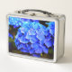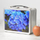 Esta lonchera tiene el azul, pero su azulada frescura floral puede hacerte feliz. Presenta una imagen fresca del jardín de hortensias azules - una foto original que ha sido tratada con efectos especiales para simular texturas. Podrás tomar los bonitos tonos azules de esta lonchera florida dondequiera que vayas a comer. Hermoso y práctico. Esta caja de almuerzo se muestra aquí con guarnecido azul, pero está disponible con otros colores y guarnecido de acero.