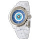 Blue Mati Evil Eye símbolo reloj de esmalte blanco para las mujeres. Icono azul de Azure griego / turco para protección y buena suerte. Señoras personalizados observen. Personalizar con texto opcionalmente.
