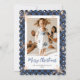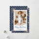 Cuta foto azul de Feliz Navidad con copos de nieve, estrellas y caída de nieve contra un patrón azul de chapa búfala. Personaliza fácilmente esta tarjeta azul de vacaciones con tu foto y texto.