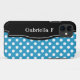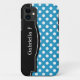 Elegante funda para iPhone 5 diseñado con puntos de polka blanco sobre un patrón azul, un marco negro sobre el lado izquierdo y personalizado con su nombre o texto personalizado en blanco sobre el marco negro. Este diseño es perfecto para el uso vertical y horizontal del iPhone 5.