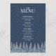 A rustic winter wedding menu with a beautiful snow covered evergreen forest at night in dark navy blue and white.