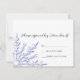 Personalizar el festivo copo de nieve azul en la tarjeta de respuesta RSVP de la boda blanca de invierno con tu fecha específica de respuesta matrimonial de diciembre, enero o febrero. Esta elegante tarjeta con el tema r.s.v.p., de invierno personalizado, presenta un intrincado diseño de copos de nieve con un matiz azul añadido y un fondo blanco.