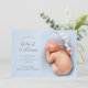 Los anuncios de nacimiento elegantes y dulces incluyen tu foto favorita del recién nacido en sangre completa, con el nombre de tu bebé, estadísticas de nacimiento y tus nombres en escritura caligráfica gris (o cualquier color que quieras) centrada en la parte inferior. En la parte posterior, cambie el color de fondo a cualquier color que se adapte a la foto bajo los puntos de polka blanco o quite los puntos.