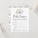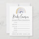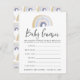 Cuidada tarjeta de juego con ducha de bebé con un arco iris dorado y azul en la parte superior. La frase "Baby Guesses" aparece en un guión moderno de caligrafía. Personalice con instrucciones del personalizado, criterios de adivinación, el nombre de la futura madre y la fecha de la ducha de bebé. El diseño se coordina con nuestra colección Arcoiris de color café y niños.