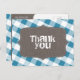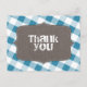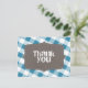 Las postales diseñadas con "Gracias" en blanco sobre un ilustracion de textura de tela de armazón marrón, en un patrón diagonal de gingham azul y blanco inspiran el país del sur. El reverso se personaliza con tu propio mensaje personalizado de agradecimiento. También puede borrar fácilmente el texto de la plantilla para dejar la(s) tarjeta(s) en blanco para escribir a mano sus propios sentimientos de gratitud. Estas tarjetas, con su patrón clásico de gingham, son perfectas para las celebraciones de Baby Shower y Southern Bridal Shower.