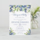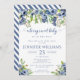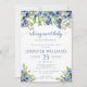 Encanto en la elegancia de nuestra invitación a la ducha de bebé, adornada con impresionantes flores azules de color azul de agua, que transmiten el mensaje de "un bebé dulce de berry está en camino".