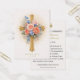 A radiant gold cross is adorned with soft blush roses and delicate blue florals, creating a refined and timeless palette that complements both classic and modern Catholic weddings. Gentle golden rays extend from the cross, symbolizing the grace and light bestowed upon the bride and groom through the sacrament.
