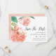 Elegante floral guardar las tarjetas de fecha con peonías acuarelas en rosa y melocotón, acentuadas con vegetación exuberante. Personalizar con sus nombres, fecha de boda, ubicación e información del sitio web o invitación del boda, debajo de "guardar la fecha" en el guión de caligrafía de moda. Las tarjetas se invierten a un suave fondo de lavado de color color azul turbio.