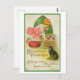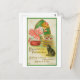 Esta postal es una reproducción de una postal de Halloween vintage que presenta un gato negro y un chica que se balancea para manzanas.