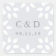 Selle sus sobres de invitación a la boda, favores y más con nuestros elegantes pegatinas de inspiración marroquí en blanco y gris claro y fresco. El diseño cuadrado redondeado presenta sus iniciales y fecha boda rodeadas por un borde geométrico en blanco sobre un fondo gris pálido. Coordina con nuestra colección de invitaciones a bodas árabes en Champagne.