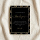 Añade un toque de lujo a tu recepción de bodas con estas tarjetas de agradecimiento personalizadas, con un elegante fondo negro y un sofisticado patrón de hojas de helecho dorado. Cada tarjeta está bellamente diseñada con un guión elegante y una tipografía moderna, creando un ambiente refinado perfecto para la familia y los amigos. Coloque estas tarjetas en cada mesa para expresar su más sincera gratitud y hacer que todos los invitados se sientan personalizares especiales con nombres individuales y mensajes de agradecimiento. El efecto dorado impreso ofrece una moda, un aspecto glamuroso, ideal para una celebración elegante que honra su viaje recién hecho.