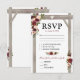 Tarjetas de respuesta de boda de otoño con un fondo blanco elegante y chic que se puede cambiar a cualquier color, una elegante exhibición floral en acuarela de color burgundy, marsala rojo y rubor en un arco de boda de madera rústica, un corazón tallado con las iniciales de la pareja, y una moderna plantilla de RSVP de boda con una opción de menú.