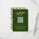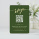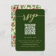 Esta rústica tarjeta de respuesta boda incluye un lugar para su código QR para que los huéspedes puedan ir fácilmente a su sitio web boda. El frontal presenta un diseño sencillo y limpio con una tipografía de escritura moderna y un fondo verde. La parte trasera es una hermosa bayeta botánica y la huella verde de las vacaciones, perfecta para Navidades o bodas de invierno.
