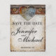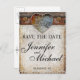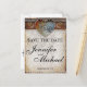 Tantos detalles sutiles se pueden ver en esta tarjeta postal de guardar la fecha de la boda. Desde un fondo de madera que tiene textura de arpillera adornada con encaje. Desde el corazón de metal envejecido en el centro con una ilustración del granero en medio de él y diamantes falsos. Flores de metal falsas, ojetes y botones adornan la pieza de cuero superior, así como elementos floreados. La tipografía elegante y divertida se coloca encima de la textura de arpillera tanto en la invitación de boda como en la respuesta. ¡Se imprime bien en cualquier cartulina!