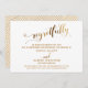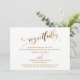 La distinción de este conjunto se debe a la fuente de escritura moderna adornada con corazones y un efecto de lámina de oro falso utilizado para acentuar frases. Si estás en la posición de necesitar informar a tus invitados de boda que estás cancelando tu boda, aquí tienes una opción elegante. En esta pieza, se utilizó la bonita fuente de escritura para crear un gráfico que simplemente representa la palabra "lamentablemente". Utiliza los campos de la plantilla para agregar tus datos personales y hacer que este diseño moderno y único sea tuyo. El fondo blanco se puede cambiar a cualquier color que prefieras. La parte trasera ha sido cubierta con un patrón de oro repetido que permite que el color que elijas se muestre entre las líneas. Por favor, ponte en contacto con nosotros para cualquier solicitud especial o para obtener ayuda para personalizar. // 80 //