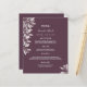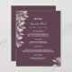 Carta boda elegante y de moda. Flores botánicas de color rosa, hojas. Plantillas para los nombres, fecha y menú boda. Una moda, fondo violeta profundo. Letras de color blanco. Parte posterior: fondo de color cassis.