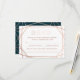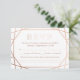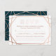 Una tarjeta de respuesta nupcial contemporánea y moderna, presenta un patrón geométrico rosa de oro "falso Relieve metalizado" sobre un fondo turquesa oscuro. Todos tus detalles están escritos en un bonito y moderno error. Yo sí ofrezco un servicio de personalización gratuito, si tiene alguna solicitud especial, por favor envíeme un correo electrónico a: margherita@bluebirdinvites.com El franqueo de EE.UU. correspondiente está disponible aquí: http://www.zazzle.com/collections/geometric_winter_wedding_set-119231006408651896 Pulsando sobre el botón del personalizar puede acceder a las herramientas de edición y cambiar el color de fondo, el tipo y mucho más Nota ____________________________________________________________________________________________________________________________________________ El color de cobre metálico no es Relieve metalizado real, es sólo un efecto de color __________________________________________________________________________